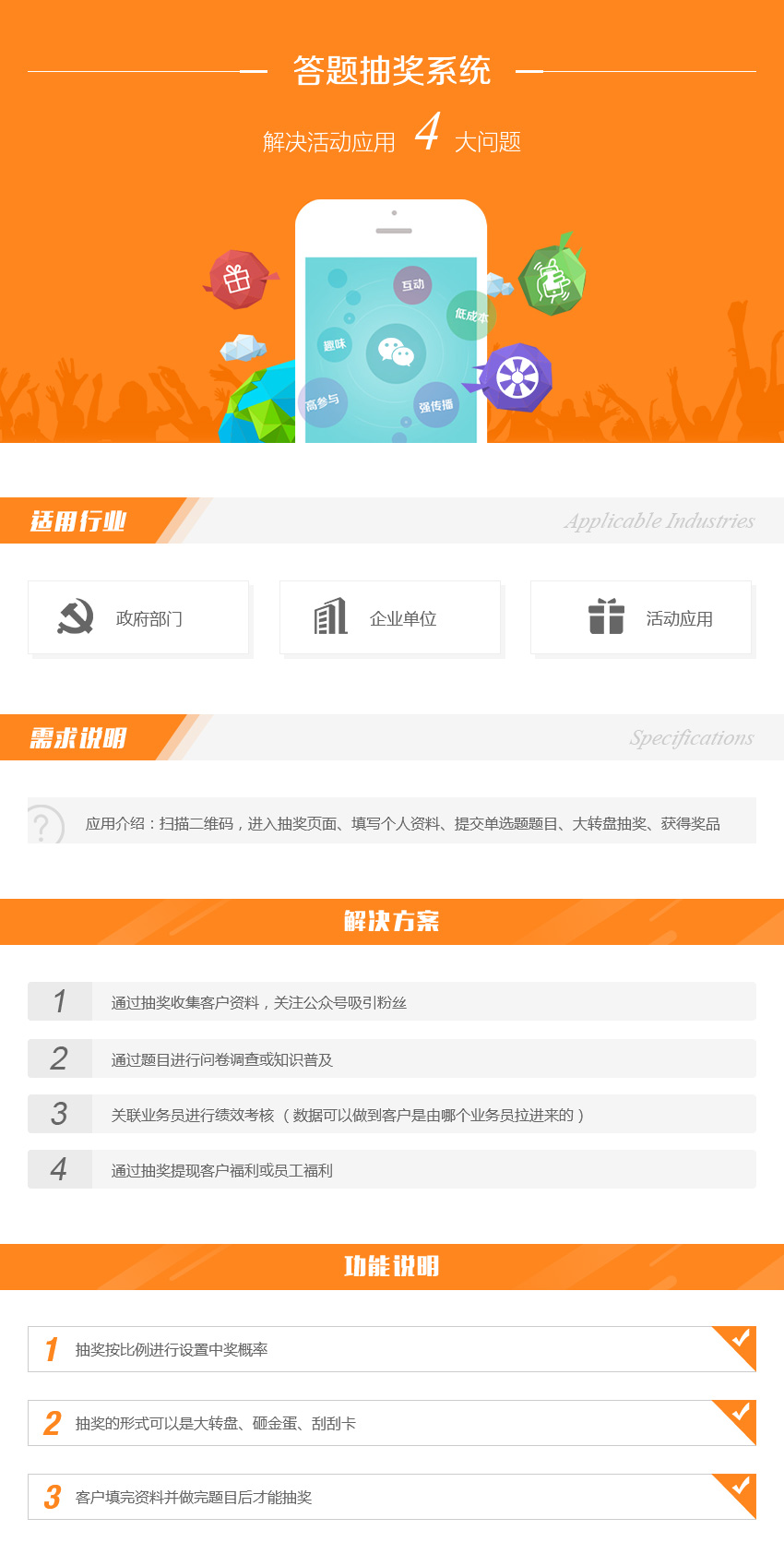 应用介绍:扫描二维码,进入抽奖页面、填写个人资料、提交单选题题目、大转盘抽奖、获得奖品。